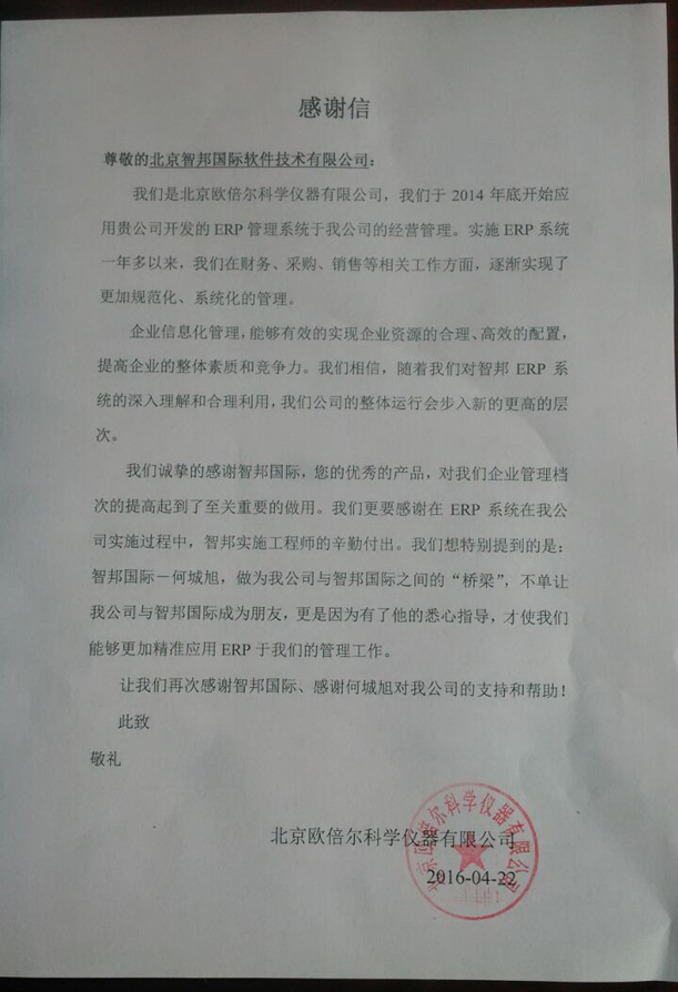 北京欧倍尔科学仪器有限公司基于智邦国际ERP解决方案,实现了在“全程一体化管理”理念下企业所有资源、业务的统筹规划、集成管理、自动协同,也实现了实时、精准、安全的信息共享和快捷、高效、无缝的办公沟通,由此大幅降低了管理和运营成本,进一步扩大了欧倍尔在全球市场的份额,具有深刻的历史意义和示范价值。相信未来还会有更多的企业将通过智邦国际ERP系统实现管理和经营模式创新,以此实现可持续发展。