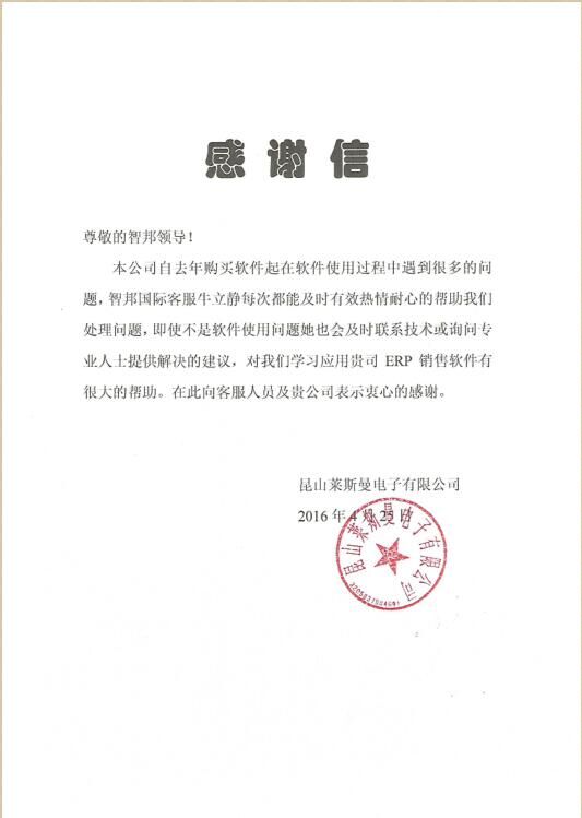 智邦国际是国内企业管理软件最具影响力品牌,经过10多年的发展,以独特、完备的服务理念快速响应客户需求,为企业提供全生命周期的服务,是广大企业的选择。了解到江苏苏州莱斯曼电子有限公司的业务特点和管理需求后,智邦国际工程师第一时间为其部署了一套ERP系统。