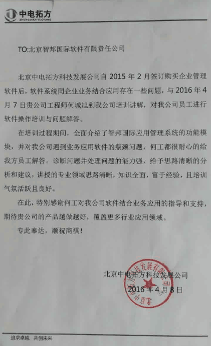 北京中电拓方科技发展有限公司与智邦国际正式签约,希望在智邦国际ERP软件的协助下,将先进信息科技应用于企业发展战略,高效配置有限的人员、资金、物资等资源,实现决策层、管理层、执行层、操作层全员协同,全面提升每一个人、每一件事、每一个环节执行力,促进企业管理精细化、资源利用高效化、市场反应实时化、战略决策精准化。