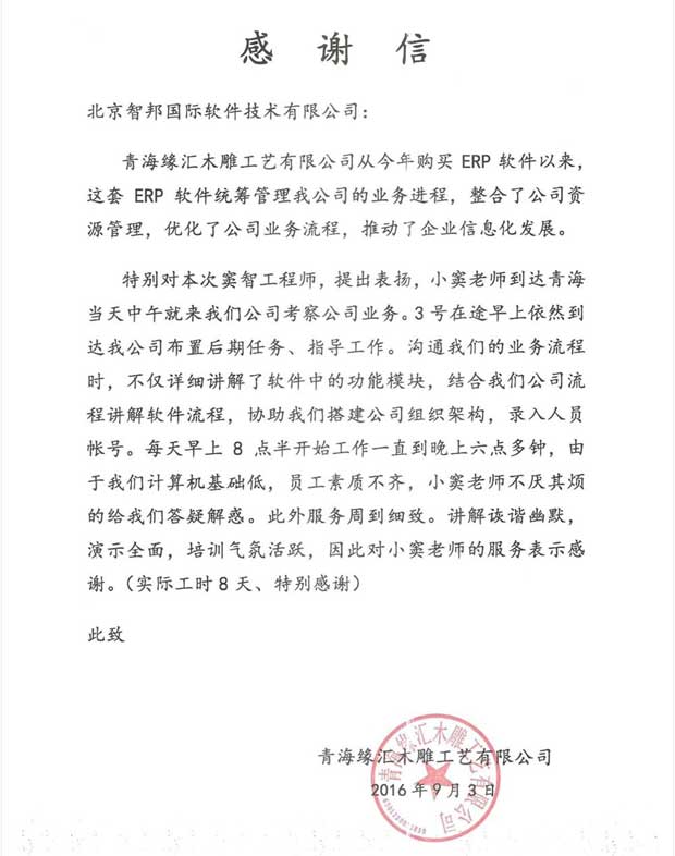 青海缘汇木雕工艺有限公司感谢信