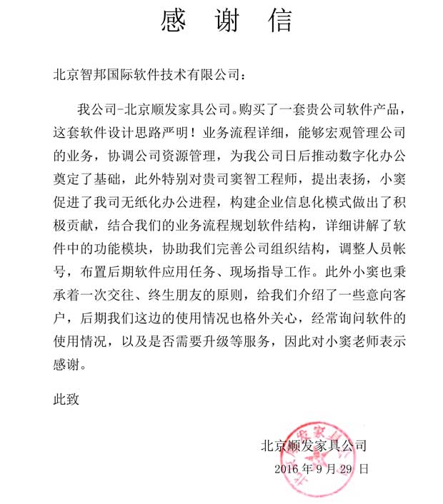 北京顺发家具公司感谢信