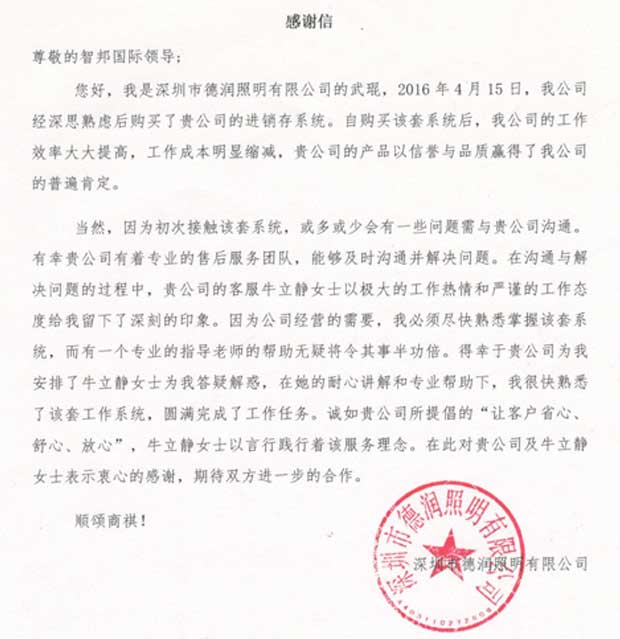 信息化管理可让企业信息资源共享,快速应变,可视化管理则可让企业信息流程透明,高效传达,二者结合有助于企业全面洞察经营状态,快速精准商业决策。相信在智邦国际进销存系统的协助下,广东深圳德润照明有限公司定能打造信息化、可视化、自动化业务流程,用有效数据、精准决策、快速反应推动全球业务持续健康发展,领先一步抢占商机。
