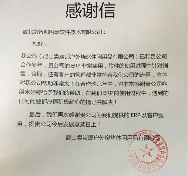 昨天的业绩意味着今天的信心,预示着明天更广阔的前景。从2013年应用智邦国际进销存系统至今,江苏昆山卖炭郎户外烧烤休闲用品有限公司不断将最新功能应用于日常管理和提升效率,使管理水平和综合实力稳步提升,相信在智邦国际进销存系统的协助下,定能在管理上与时俱进,在品质上精益求精,不断整合优质资源为客户创造价值,在国际化发展中越来越顺利。