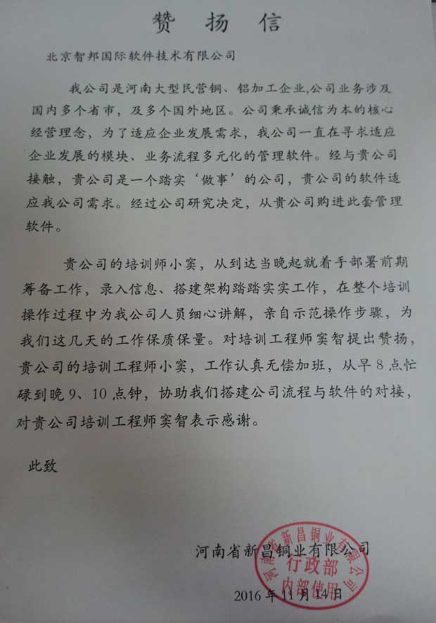 经过多年努力发展,公司规模不断扩大,业务日益广泛。面对如此广阔的市场前景,原有管理系统因功能无法扩展,严重影响发展速度,管理层决定寻找行业领先的管理软件,走可持续发展之路。经过深入的市场调研和业内专业人士推荐,最终,河南省新昌铜业有限公司决定与智邦国际合作。了解其业务特点和管理需求后,智邦国际工程师第一时间为其部署了一套ERP软件。