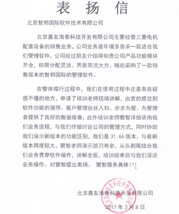 北京嘉友海泰科技开发有限公司感谢信