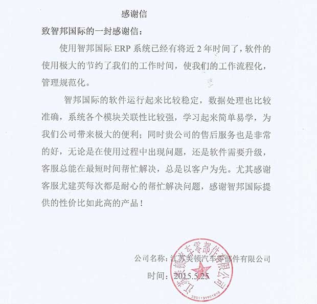 江苏美顿汽车零部件有限公司感谢信