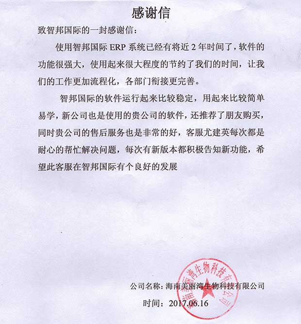 企业要向管理要效益,目前唯一的方法就是避免人情化,按照制度严格执行,这就必须借助于企业信息化。相信在智邦国际进销存系统的协助下,海南美丽湾生物科技有限公司定能实现进、销、存、财业务无缝集成和全面协同,加速信息化建设步伐,通过规范、高效、灵捷的供应链体系,源源不断的为客户创造价值!