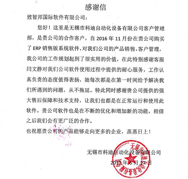 随着公司在行业内继续发展和壮大,管理层希望在高标准的技术和高品质的服务基础上,部署一套现代化的企业管理机制。经过深入的市场调研和业内专业人士推荐,最终,江苏无锡科迪自动化设备有限公司决定与智邦国际合作。了解其业务特点和管理需求后,智邦国际工程师第一时间为其部署了一套ERP系统。