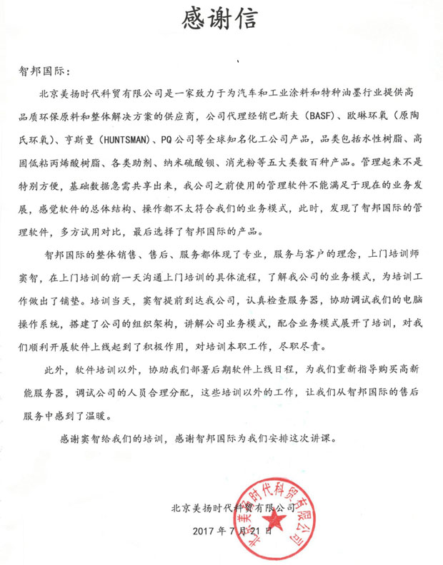 北京美扬时代科贸有限公司感谢信