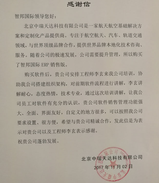 在激烈的市场竞争中,只有不断完善管理理念,才能与时俱进。相信在智邦国际ERP系统的协助下,北京中瑞天达科技有限公司定能实现企业资源与ERP系统的无缝整合,将人、财、物等纳入一个平台统一管理,加速信息、资金、业务的高效流动,走可持续发展之路!