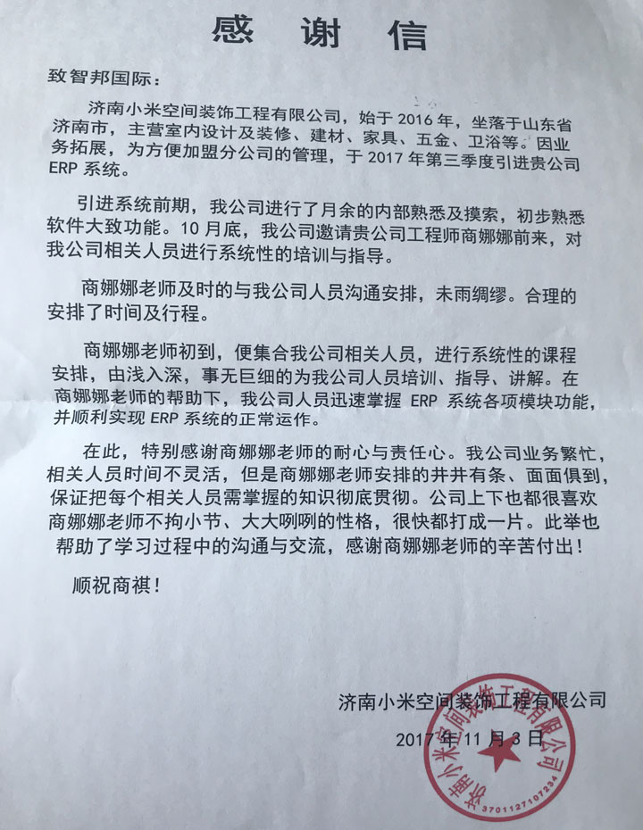 随着市场竞争日趋激烈,要想把企业做大做强,必须紧跟时代趋势打造全新管理模式。相信在智邦国际ERP系统的协助下,山东济南小米空间装饰工程有限公司定能引入先进管理思想和信息系统,不断优化现有管理模式,降低运营成本,以优异产品和服务,赢得客户长久信赖,在以后发展中越来越顺利!