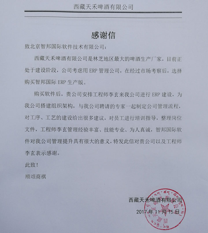 信息时代来临,让企业面临全新挑战和机遇,一体化管理结束企业业务长期割裂状态,保证决策数据的全面性、精准性、时效性以及决策过程的科学性,越来越成为企业信息化的要求和趋势。相相信在智邦国际ERP系统的协助下,西藏天禾啤酒有限公司定能实现人、财、物、信息的一体化管理,实时、动态地掌控经营和生产状态,快速应对市场变化,不断把握发展机遇,实现更快、更好发展。