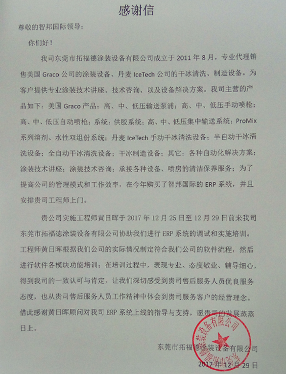 广东东莞市拓福德涂装设备有限公司智邦国际ERP系统项目实施现场