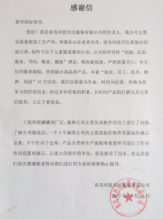 青岛珂恩贝比服饰有限公司智邦国际ERP系统实施现场