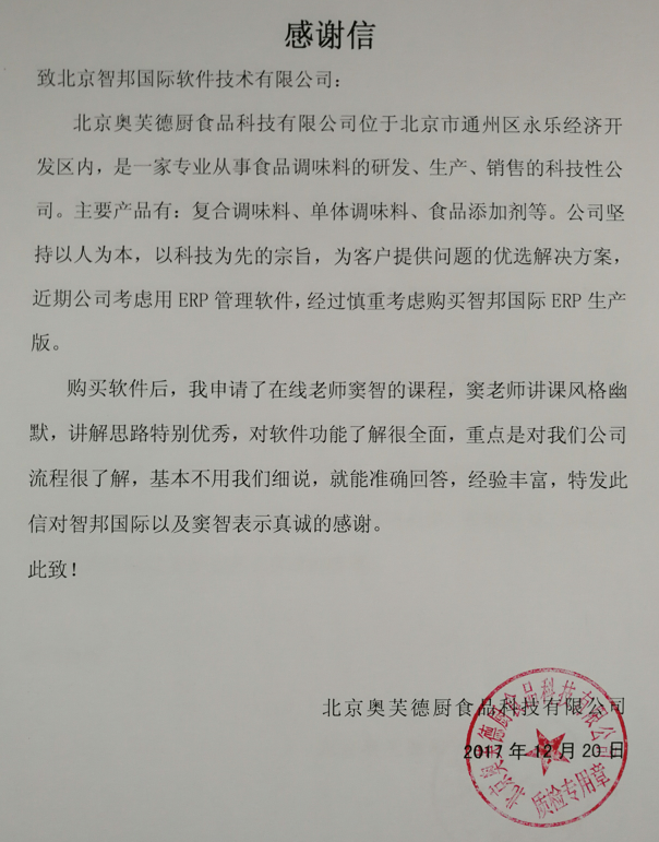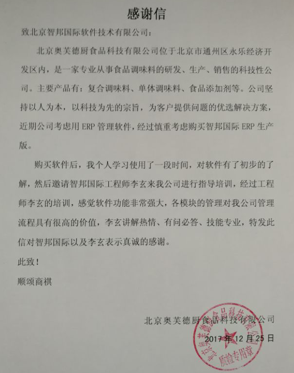 随着科学技术的进步,北京奥芙德厨食品科技有限公司迅速扩张,生产线、采购、仓库、销售等管理工作繁杂,整个企业面临着管理变革,尤其是生产管理,涉及到生产排产、生产工序、生产质检等众多管控环节,急需一款信息化管理系统来辅助办公。北京奥芙德厨食品科技有限公司通过多方考察和综合对比,最终选择智邦国际;在了解其情况后,智邦国际实施工程师立即制定了实施方案,为其部署了智邦国际ERP系统。