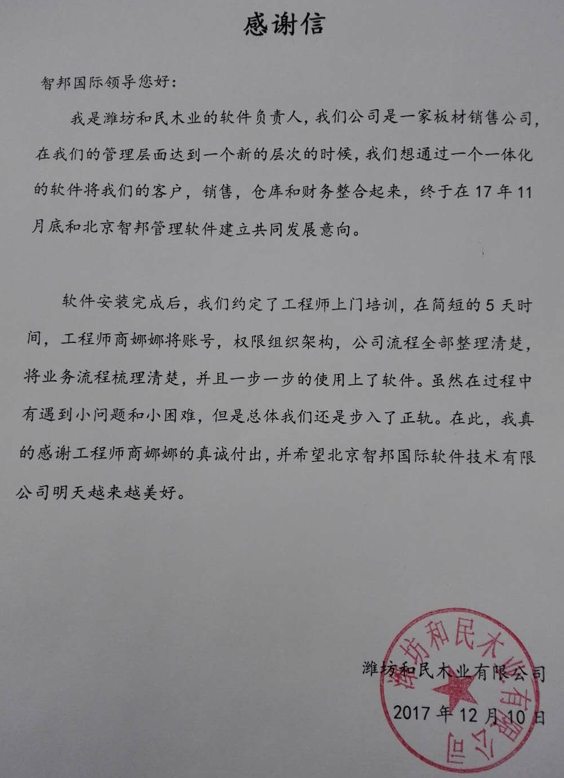 潍坊和民木业有限公司感谢信