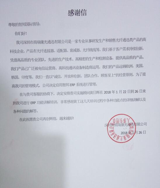 深圳市商瑞康光通迅有限公司感谢信