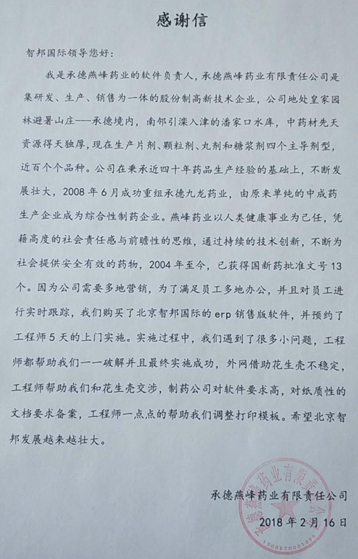 承德燕峰药业有限责任公司感谢信