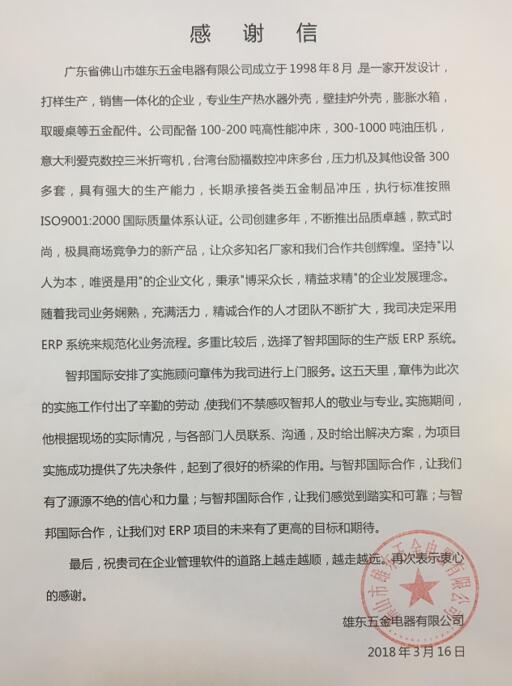 佛山市雄东五金电器有限公司智邦国际ERP系统实施现场