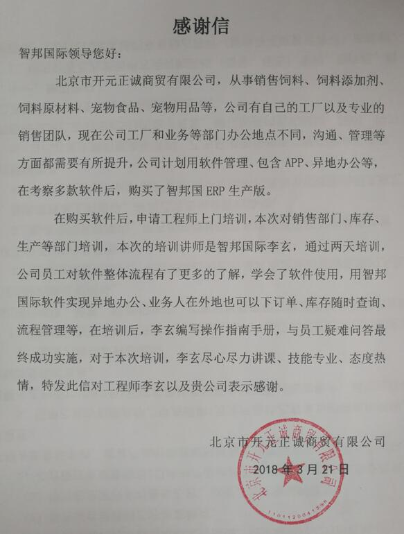 北京市开元正诚商贸有限公司感谢信