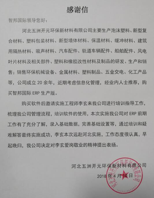 随着河北五洲开元环保新材料有限公司二十多年的发展,规模逐渐壮大,像采购、销售、仓库、生产、物料、排产、人事、固定资产、成本核算等管理,都需要快速变革,管理层决定通过信息化管理软件的应用,助力企业管理;通过功能、服务、软件商资质等多方面考虑,层层筛选,最终与智邦国际达成合作;在了解客户情况后,智邦国际实施工程师立即根据情况制定了实施方案,为其部署了智邦国际ERP系统。
