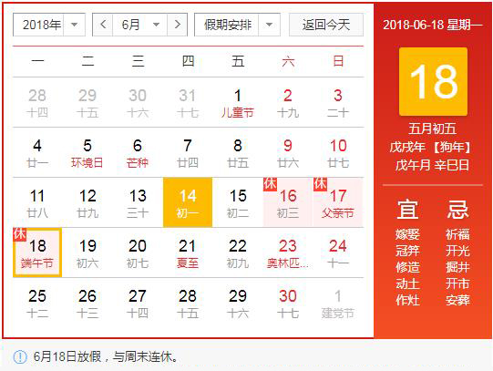 6月18日(端午节,星期一)放假,与6月16日(星期六)、6月17日(星期日)连休,共3天。6月19日(星期二)照常上班。放假期间若给您带来不便,敬请谅解!