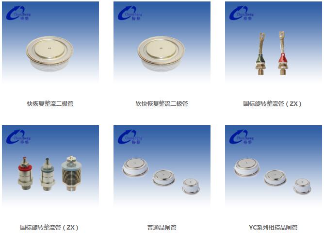 公司生产的电力半导体器件有:普通整流管(ZP),快速整流管(ZK),软恢复快速整流管(FRD),旋转整流管(ZX),大功率组合整流元件,普通晶闸管(KP),快速晶闸管(KK),双向晶闸管(KS),逆导晶闸管(KN),可关断晶闸管(GTO),电力晶体管(GTR),功率模块(MTC,MFC,MDC,MDQ),发电机旋转励磁整流组件,各种功率单元。这些元件广泛应用于电化学电源,充电电源,电机调速,感应加热及热处理等各种整流、逆变和变频领域。