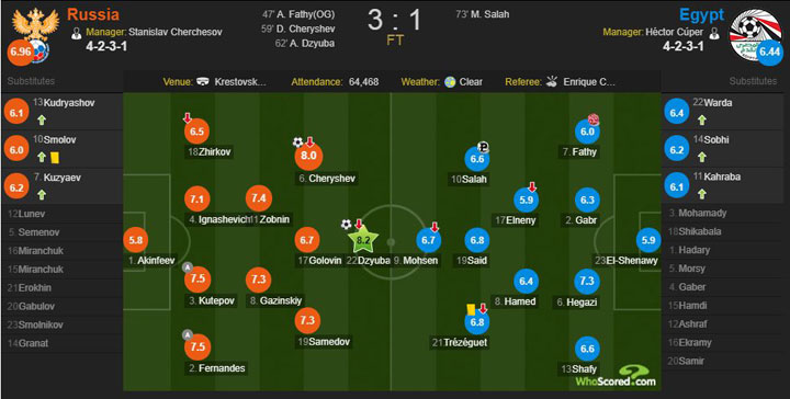 俄罗斯队(图左)采用4231阵型3:1战胜埃及队(右)