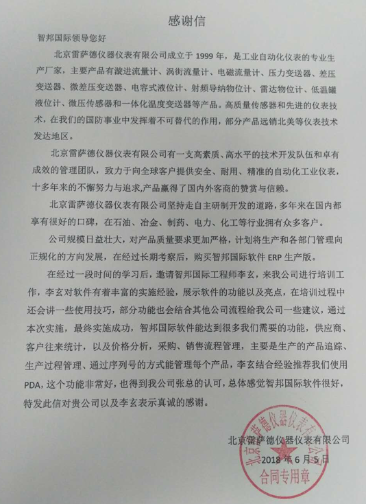 北京雷萨德仪器仪表有限公司感谢信
