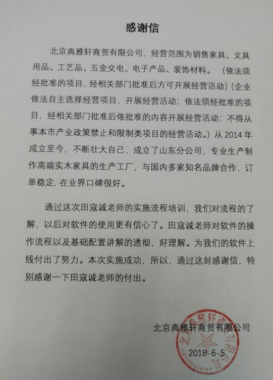 北京典雅轩商贸有限公司感谢信