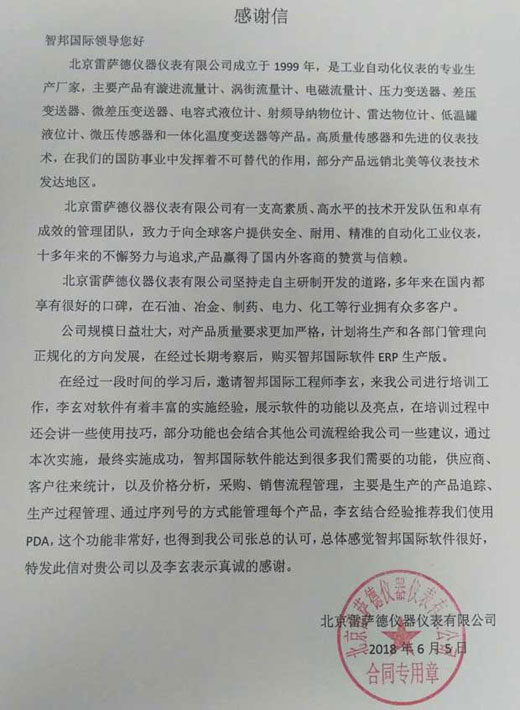 获北京雷萨德仪器仪表有限公司书面致谢