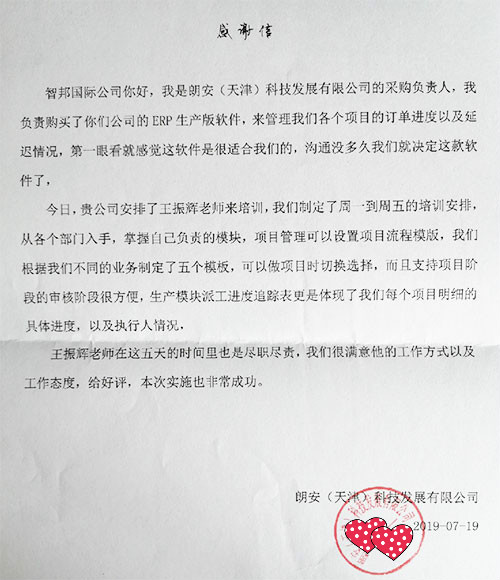 朗安(天津)科技发展有限公司智邦国际ERP系统感谢信