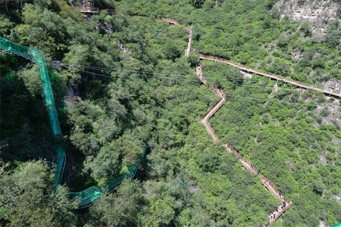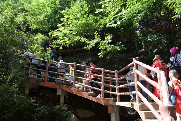 紧接着就是高山漂流,由于太过火爆需要排队,小伙伴们都选择徒步下山。都是不太曲折的台阶,没几分钟就回到登山起点木栈道那里。不过这回走的是旁边的铁索桥。桥上满满都是游客,向前的每一步,铁桥都像波浪一样左右晃动,非常的惊险刺激噢!