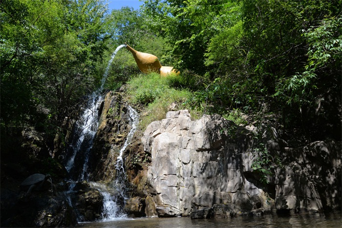 景区游人很多,为游客准备的观景台也很多,一路向上,走走停停,快到半山腰时,小伙伴们又有新发现!只见一只巨大的葫芦,正在往外喷水,撞击着山石,滋润着空气。轰然作响的声音,透着醍醐灌顶般的清凉,让我们的心灵如同受到了一场洗礼。此时才明白,原来这山间的瀑布和溪流,全都出自这只宝葫芦之口,竟然都是人工造出来的,真是巧夺天工啊!