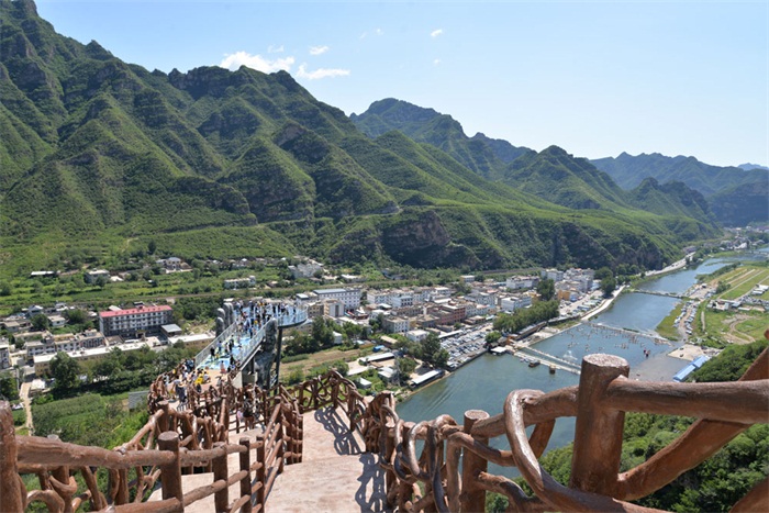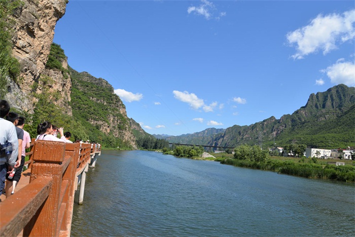 2个多小时后,我们来到了第一站,野三坡清泉山。从大巴下来,远远望去,清泉山就像一块碧玉镶嵌在我们脚下的大地。山依着水,水依着山,山连着山,像拥抱,又像是呵护,勾画出一种相偎相依的美景。望天上蓝天白云,看山中绿树成荫,到处是一片祥和恬静的景象,顿时有种拨云见日、豁然开朗的感觉。小伙伴们满满都是期待,不由自主加快了脚步。