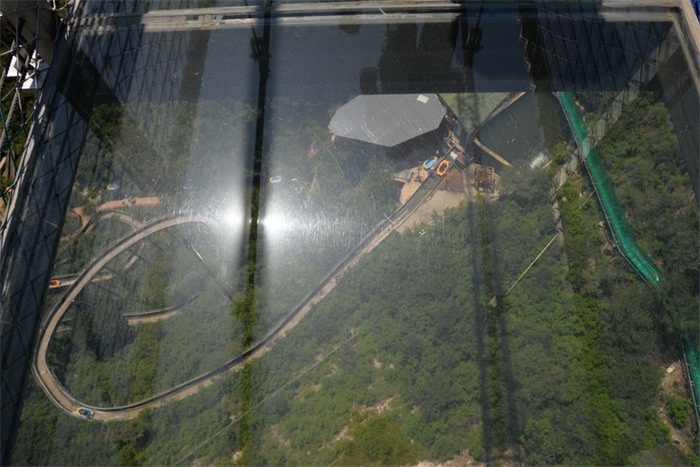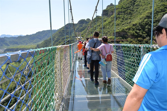 而在不远处,一座长158米的大型玻璃悬索吊桥,横跨两峰,让人震撼。漫步其上,如同行走在天空中。由于悬索桥会轻微晃动,又如在空中轻舞飞扬。头顶蓝天,两侧视野开阔,脚下大好河山,忽然觉得自己好似山间的清风、树木、石头一般,四处通达,融入这天地间。就这样720°全景观赏清泉山,很是惬意!
