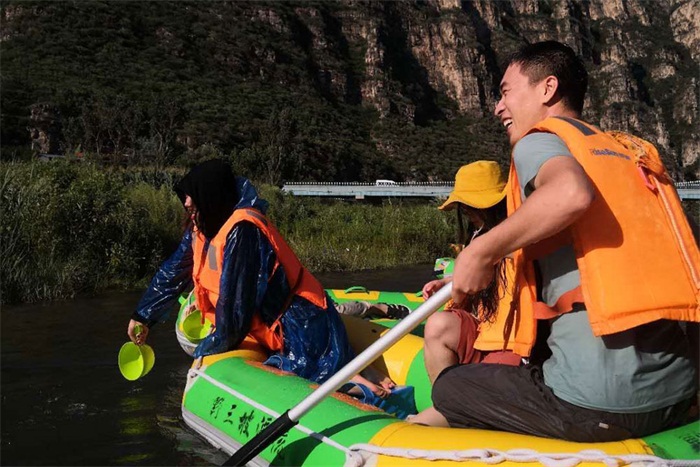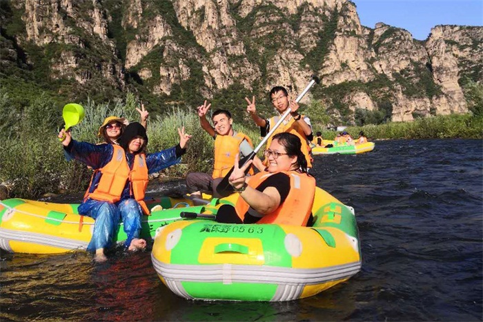 吃过午餐,继续乘坐大巴去往下一站,野三坡漂流。两人一支橡皮艇,在四面环山的拒马河中顺水漂流。时而猛的一个急流险滩,橡皮艇在哗哗水浪中旋转翻腾,极速前进,心情随着波浪起伏,一涌而下。时而在平静的河流中听流水淙淙,赏周边青山绿水田野,河底石沙鱼虾,空中蓝蝶飞来飞去,岸边各色小花绽放。感觉特别惬意!