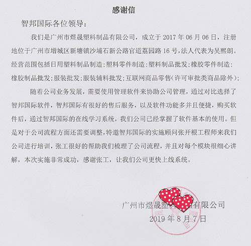 广州市煜晟塑料制品有限公司智邦国际ERP系统感谢信