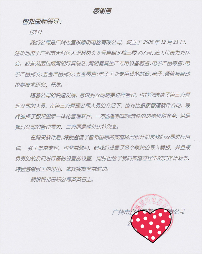 广州市宜琳照明电器有限公司智邦国际ERP系统感谢信