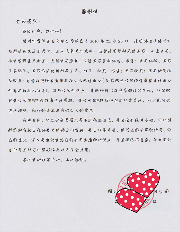 梧州市君诚宝石有限公司智邦国际ERP系统感谢信