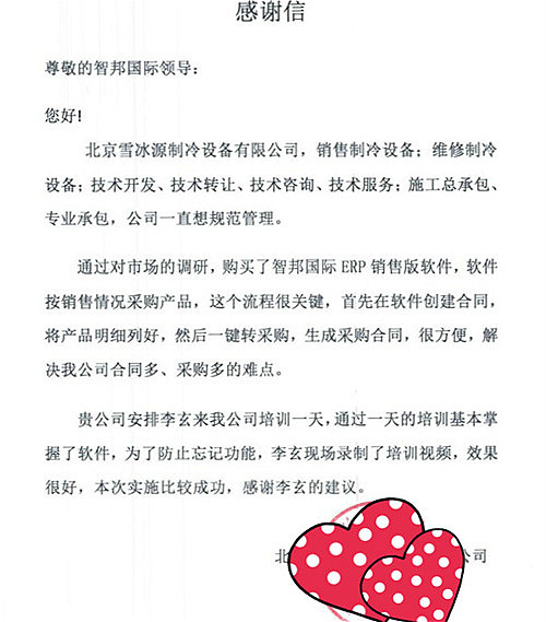 北京雪冰源制冷设备有限公司智邦国际ERP系统感谢信