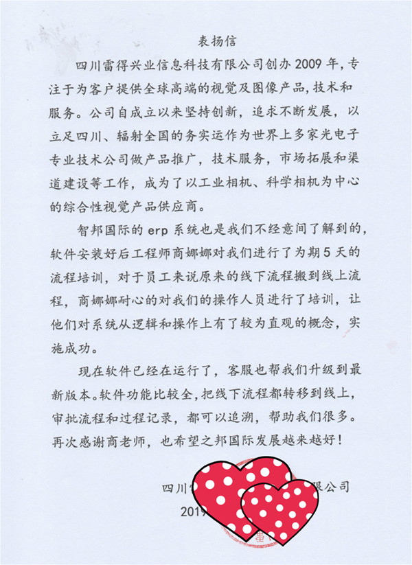 四川雷得兴业信息科技有限公司向智邦国际送感谢信