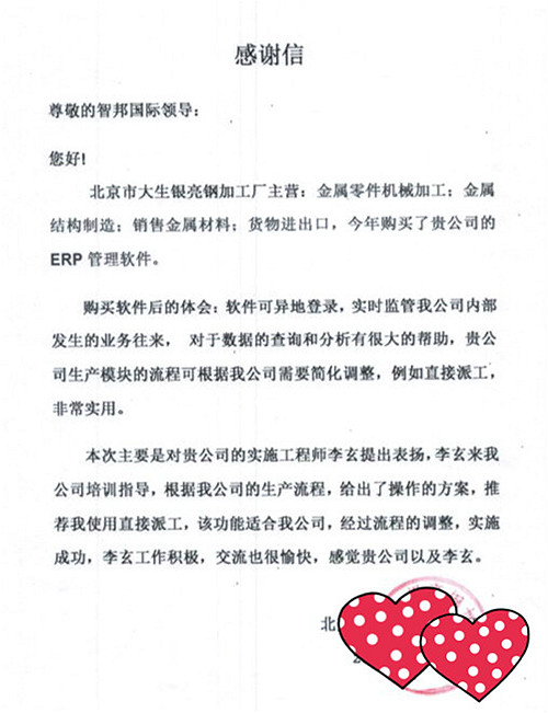 北京市大生银亮钢加工厂智邦国际ERP系统感谢信
