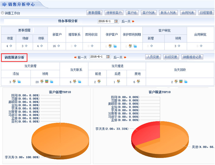 一、企业管理层可通过销售分析中心的“销售跟进分析”栏目,详细了解权限范围内销售人员当天的新增客户情况,以及销售人员当天跟进信息。可以在销售分析中心的“销售业绩分析”栏目中查看销售人员的销售额情况和回款额情况。实时透明化的信息呈现,可以改变传统的面对面汇报模式,实现零距离沟通,提高沟通的效率,减少了一些不必要的时间浪费。系统还可以设置自动提醒,提醒销售人员与客户有关的信息,例如客户生日等信息,适当的回访与祝福是对客户的一种关怀,规范的回访与提醒加强了与客户之间的沟通,有助于维护客户资源,树立良好的服务形象。