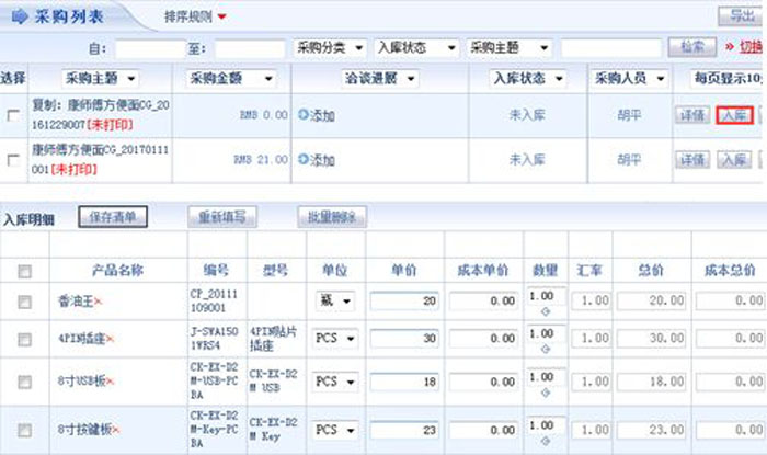 二、在系统生成采购询价定价完成后,就可以生成采购单。还可以进行多家供应商比较,系统自动记录与企业有过交易往来的供应商,倘若有产品质量或是其他方面不好的情况的话,则会在下次采购的时候智能提醒,助力企业能够在多家供应商中选择最优惠的价格、性价比最好的产品。采购单成功建立后,可以直接在采购列表中提交入库申请,并且一个采购单支持多次入库。精细化控制和跟踪供应商、来源、询价、预购、采购、质检、退货等业务全程,审批流程自定义,到货自动提醒,达成采购流程高效透明。