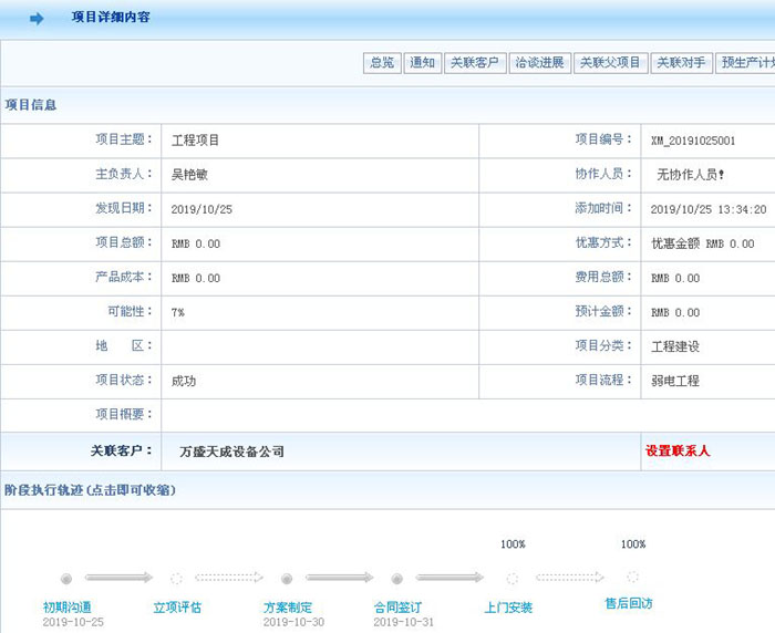 一、系统支持从项目录入、审批、分配、跟进、执行、分析,数据处理等全流程一体化运作,同时支持企业按需自定义设置,灵活应变企业管理需求。自由设置项目执行流程模版,图形化展示项目过程、当前阶段和执行轨迹,项目阶段自动触发、无缝衔接、环环相扣,助力企业一键掌控项目全进展。通过系统中的“销售漏斗”,能够清晰查看到各阶段的项目数和预计签单额,另外还能够快速计算项目的预计销售额和已使用费用。精细化呈现项目各个阶段、执行人、起止时间、预算金额、进度、状态,一键查看阶段详情,快速进行阶段变更,加速推进每个阶段执行效率。