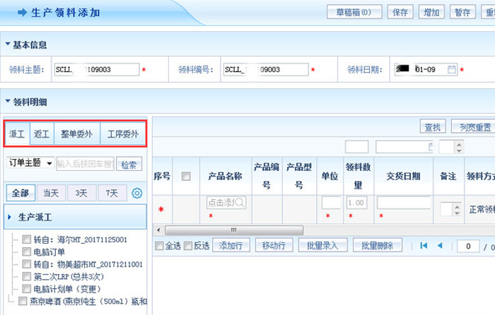 智邦国际ERP系统从派工、返工、整单委外和工序委外一键添加生产领料单