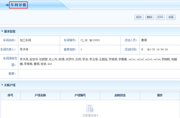 一、在系统中支持添加车间后进行后面的产线绑定和设备及工人安置,确保生产流程顺利开始和运转。通过车间管理即可一键添加车间,在车间详情界面上,可以查看车间的负责人、调用范围、关联产线等信息。此外,通过设置自动编号规则,可以自动生成车间编号,减少手动录入车间编号的麻烦,提高业务人员的工作效率。当录入的车间信息不完善或不正确需要进行调整时,还可以进行修改操作,把车间信息修改完整准确。同时,为了便于业务人员离线分析或进行线下的车间信息安排调整,支持将车间信息打印出来作线下的查阅参考。将企业的车间管理中所遇到的环节数据化实时呈现在系统上,有效传递信息,确保执行高效顺畅。