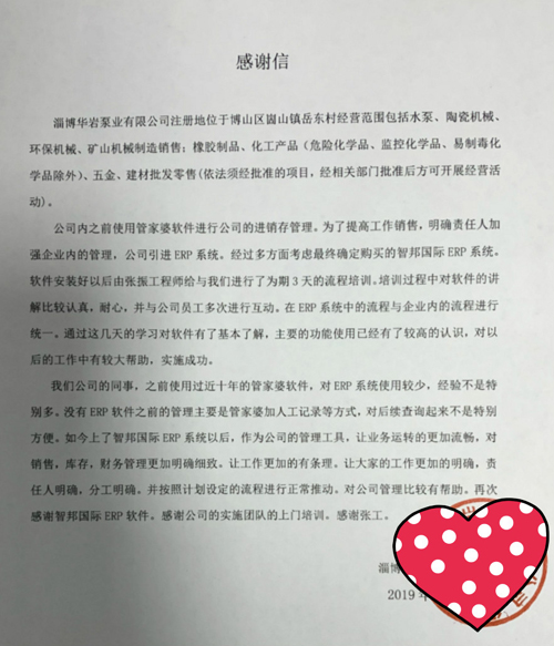 淄博华岩泵业有限公司向智邦国际送感谢信