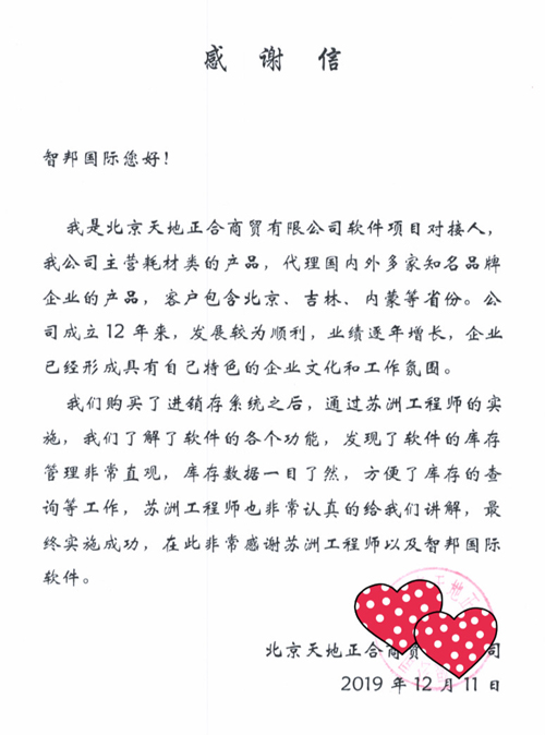 北京天地正合商贸有限公司向智邦国际送感谢信